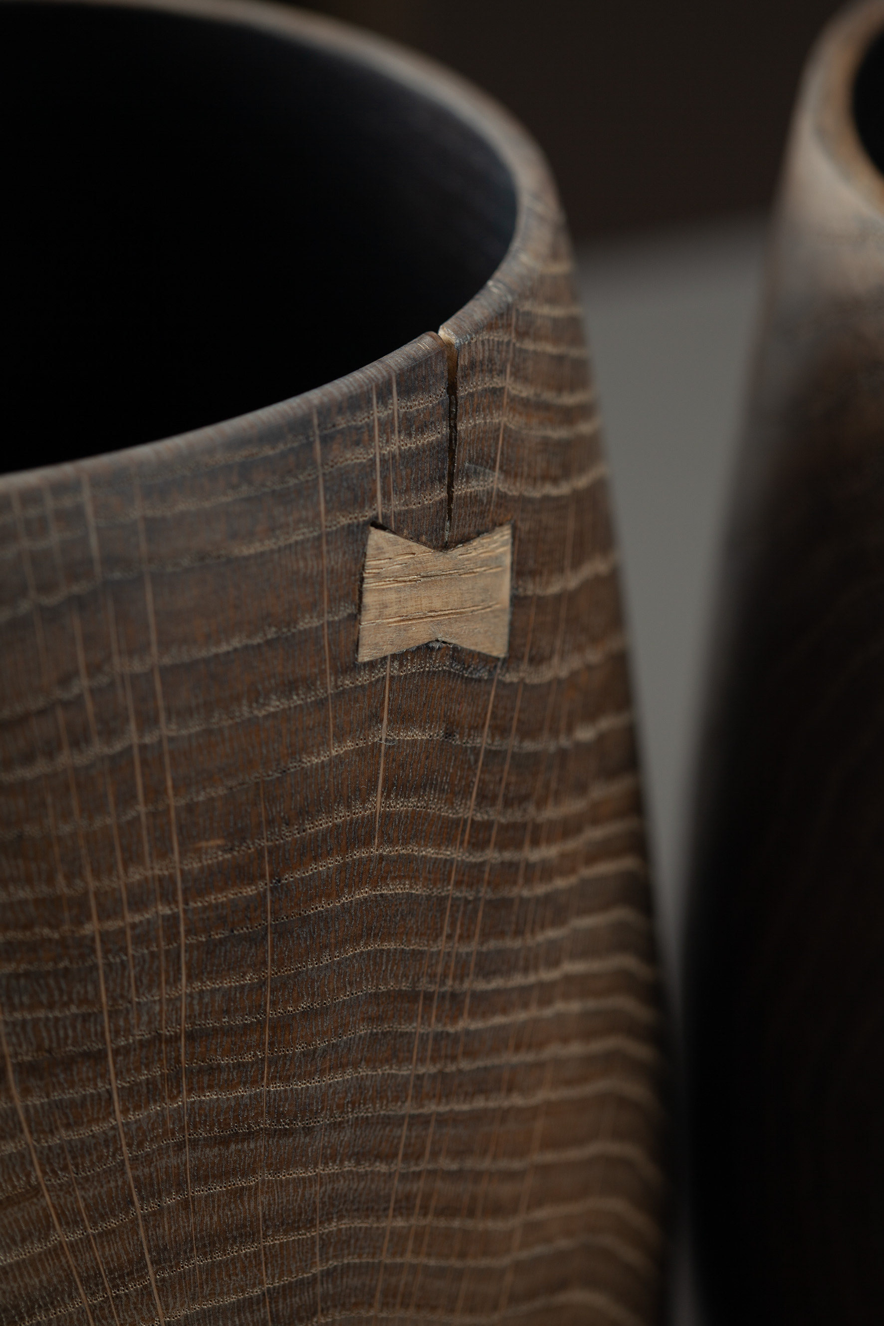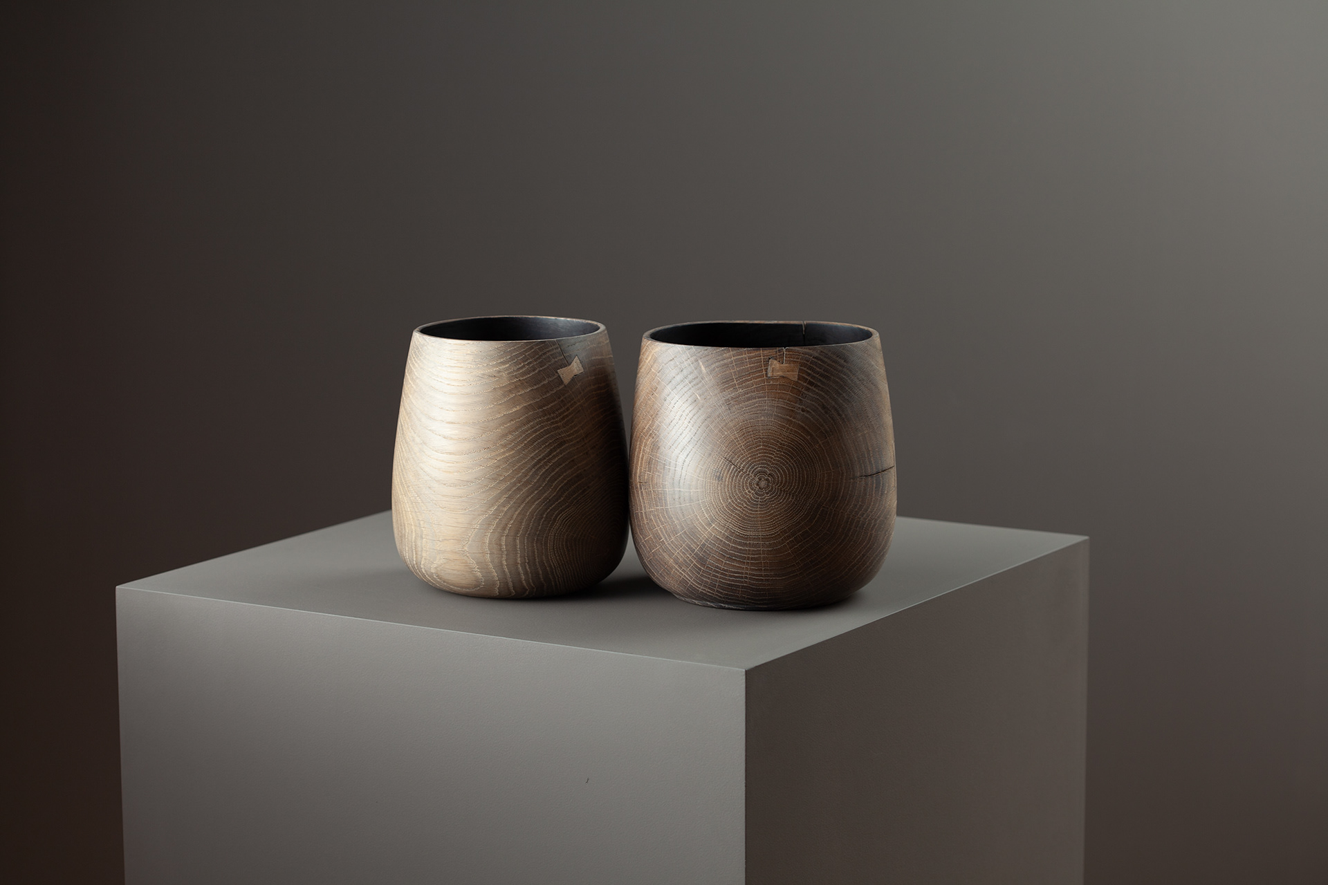 Deux vases en chêne patinés Ø x cm vendu et Ø x cm vendu